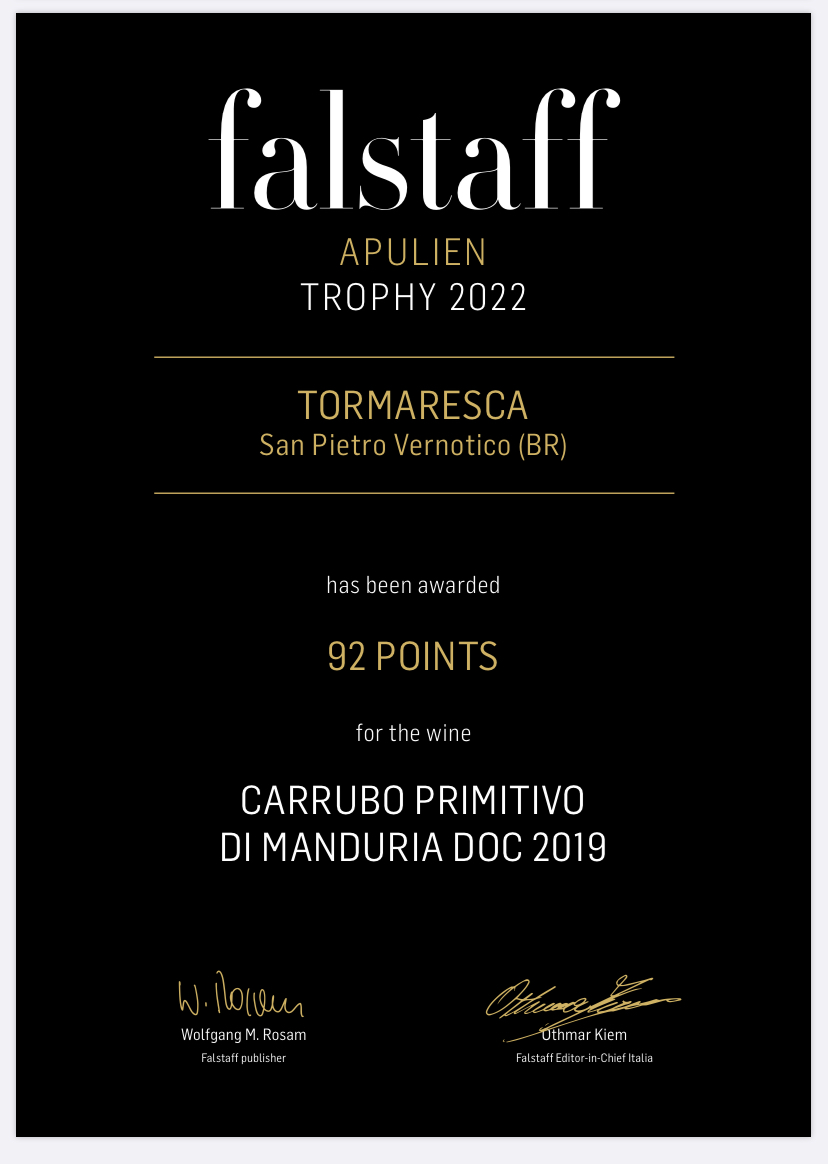 Die Tenuta Carrubo liegt ländlich gelegen rund um die Stadt Fragagnano (Apulien) im DOC-Gebiet von Manduria, etwa 120 m über dem Meeresspiegel. Die Rebsorte Primitivo gedeiht in diesem Gebiet wunderbar und zeichnet sich durch die kalkhaltigen Böden und das heiße Klima aus.