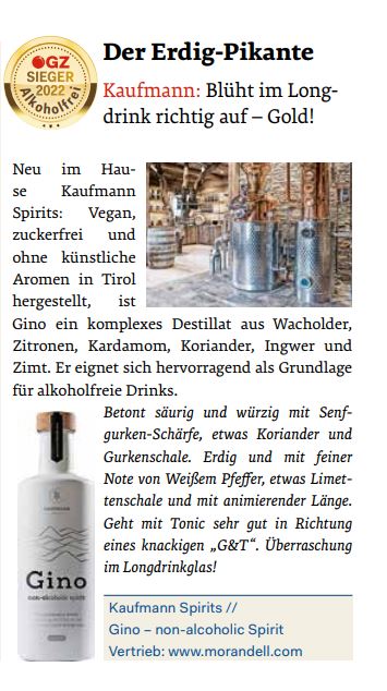 Gino bietet ein wunderbares Geschmackserlebnis, und das ohne Alkohol. Das findet auch die ÖGZ – und kürte Gino zum Sieger 2022 in der Kategorie „alkoholfreie Destillate“.